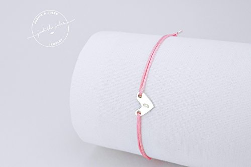 AAMOR BESCHREIBUNG Sehr zierliche, handgemachtes Armband mit einem gravierten Herz aus 925 Sterling Silber. Der Anhänger ist glänzend poliert. Das Band ist aus strapazierfähigem Nylon, robust und reißfest und unterschiedlichen Längen erhältlich. Durch den flexiblen Verschluss lassen sich die Größen, je nach Armumfang, verstellen. Leider können wir aktuell keine Gravuren anbieten! BITTE WÄHLEN SIE BEI DER BESTELLUNG : - IHRE GEWÜNSCHTE LÄNGE (BABY: 17 CM, STANDARD: 22 CM, GROß: 25 CM) - UND IHRE GEWÜNSCHTE FARBE - UND IHREN GEWÜNSCHTEN BUCHSTABEN. DETAILS Material : 925 Sterling Silber, Nylonband Längen : 17 cm, 22 cm, 25 cm Anhänger : 10 mm KOMBINATIONEN Die zarten Armbänder lassen sich besonders schön miteinander kombinieren und sammeln. Ob mehrere Anhänger auf einem Band oder mehrere Bänder übereinander getragen. Verschiedene Bandfarben machen deinen Look besonders einzigartig. Auf Bild 4 trägt das Model eine Kombination aus AAMOR und GIULIA. PFLEGE Wir empfehlen das Nylonband alle 3-6 Monate austauschen zu lassen um gröbere Abnutzungen zu vermeiden. Dabei können Sie sich gleich eine neue, frische Farbe aussuchen. Um möglichst lange Freude an Ihrem Schmuckstück zu haben empfehlen wir folgende Pflegeanleitung: http://www.judithjules.com/content/14-pflege FRAGE ZUM PRODUKT Haben Sie eine genaue Vorstellung Ihres Wunscharmkettchens und Sie haben es in unserem Sortiment nicht entdecken können? Dann schreiben Sie uns. Wir fertigen auch nach Ihren individuellen Wünschen. BITTE BEACHTEN SIE, DASS SIE MIT DEM KAUF AUSSCHLIESSLICH DEN ARTIKEL AAMOR ERWERBEN.