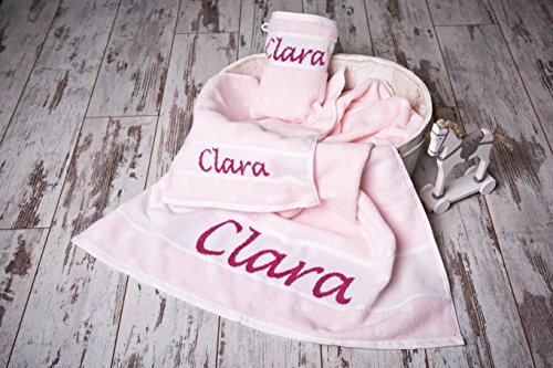 Eine praktische und schöne Geschenkidee für Geburt, Taufe, Geburtstag, Kommunion, Firmung, Konfirmation.... Wunderbar weiches Set, bestehend aus Badetuch, ca. 70 x 140 cm, Gästetuch, ca. 30 x 50 cm und Waschhandschuh, ca. 15 x 21 cm aus 100% Baumwolle, mit Wunschnamen bestickt. Ein passender Geschenkkarton als edle Verpackung ist inklusive. Du kannst dabei aus mehreren Frotteefarben und Schriftarten wählen (Frottee in rosa und hellblau gemäß Foto sind auf Lager). Ich achte auf Qualität und verwende nur hochwertige Materialien, so dass der Beschenkte lange Freude daran hat. Handarbeit benötigt Zeit, deshalb bitte rechtzeitig anfragen. Bitte beachten: Personalisierte Produkte können nicht zurückgegeben werden (siehe auch Widerrufsbelehrung)